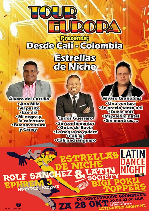 Uit Cali, Colombia komen de Estrellas de Niche, oftewel de grote sterren van Grupo Niche (een van de belangrijkste en meest populaire salsa bands uit Latijns Amerika): Álvaro del Castillo, Carlos Guerrero en Alvaro Granobles. Onder andere bekend van wereldhits ‘Al Pasito’, ‘Sin sentimientos’ en ‘Una ‘ventura’ zweepten deze zangers door de jaren heen overal ter wereld hun salsadansende publiek op, en dit zullen ze tijdens Latin Dance Night 2017 ook zeker doen! Verwacht zinderende salsa Colombiana met hits van weleer.Rolf Sanchez & Latin Society